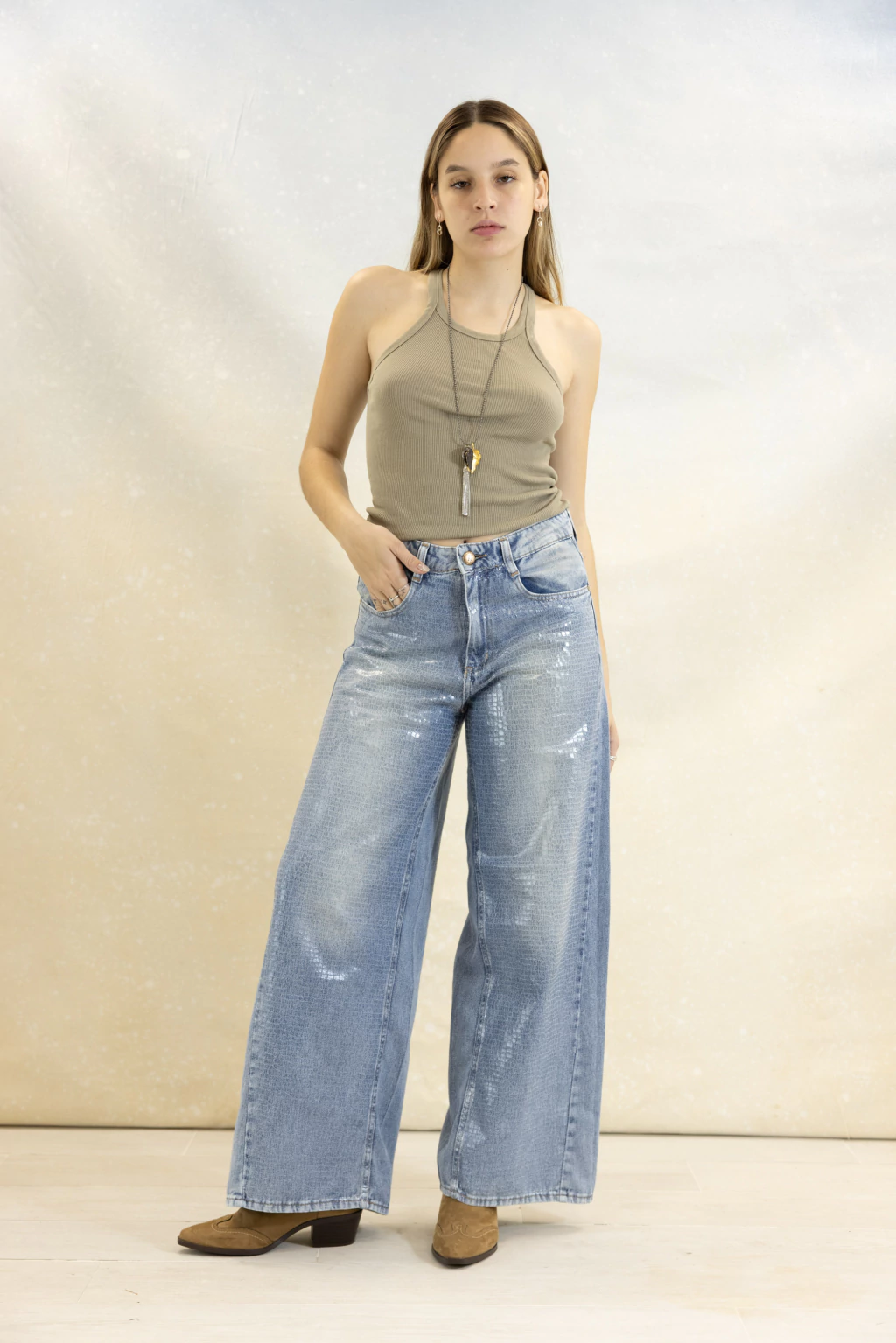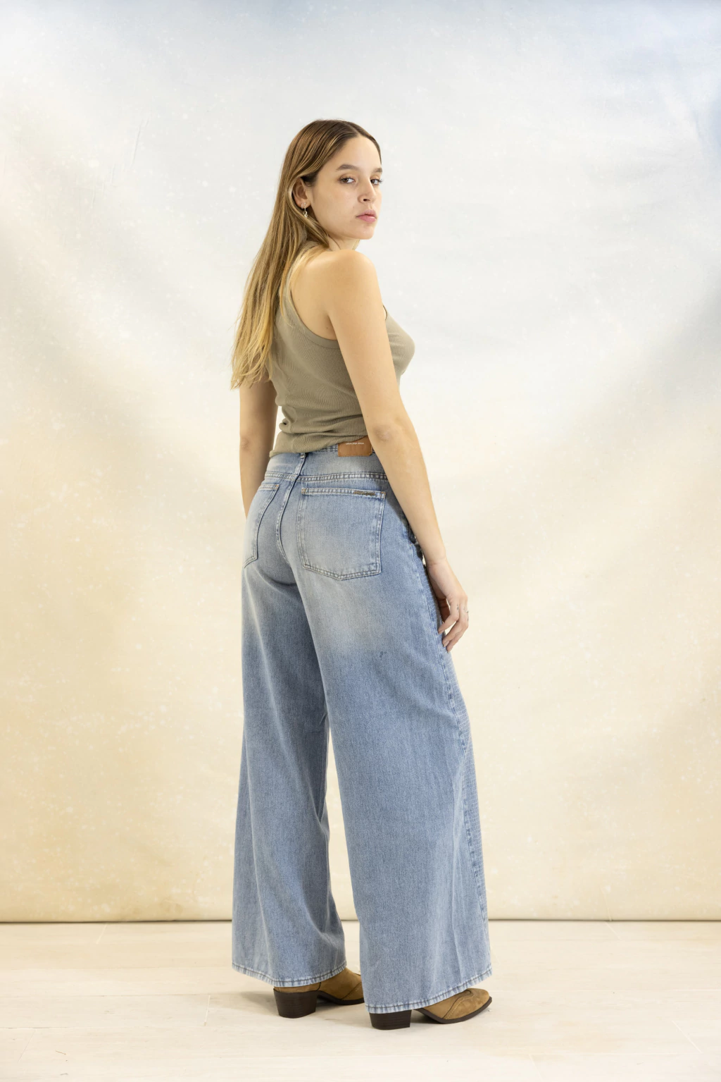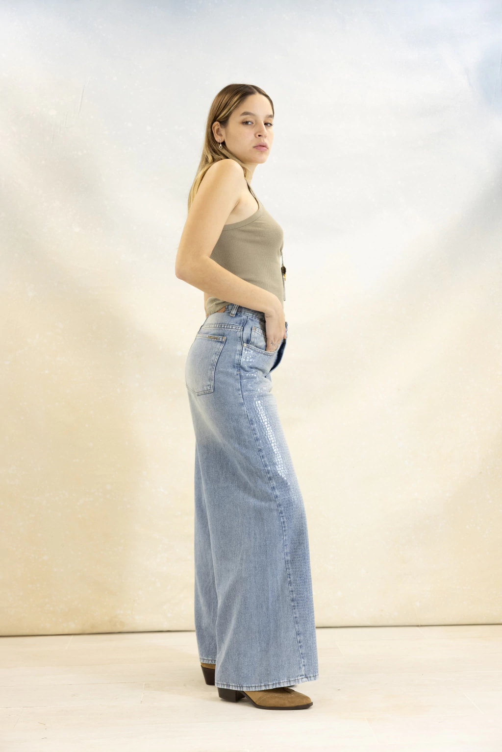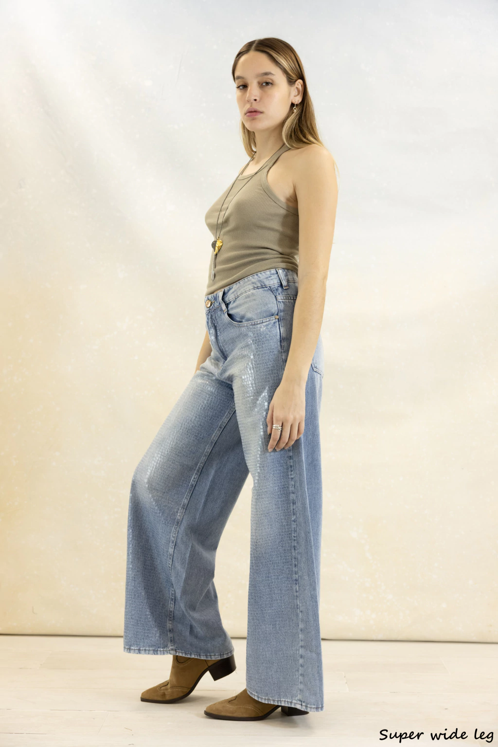 El Jean Cocodrilo es una prenda única que combina diseño artesanal y tendencia. Su corte super wide leg y tiro alto estilizan la silueta, brindando un calce moderno y suelto que aporta comodidad y movimiento.