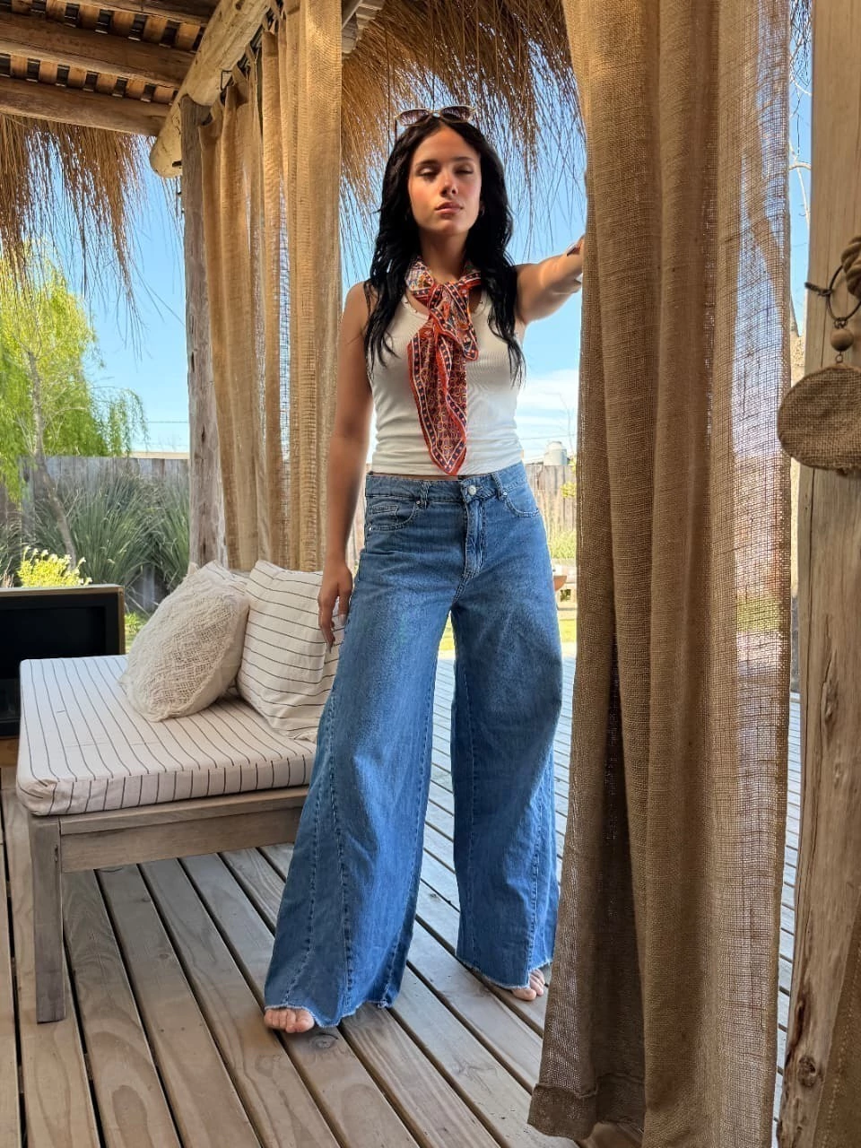 El Jean Lucy es una prenda que combina elegancia y comodidad en un diseño único. Su corte super wide leg ofrece una silueta amplia y fluida, con una caída increíble que realza cada movimiento.
