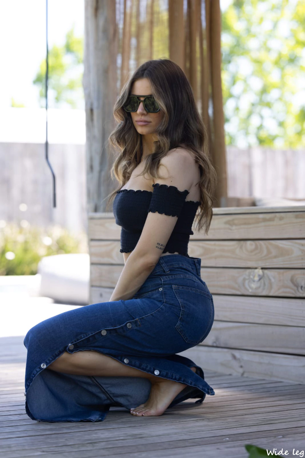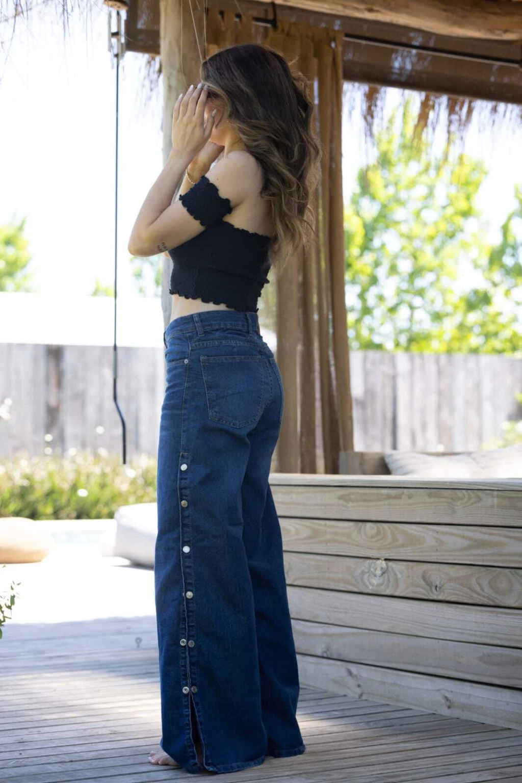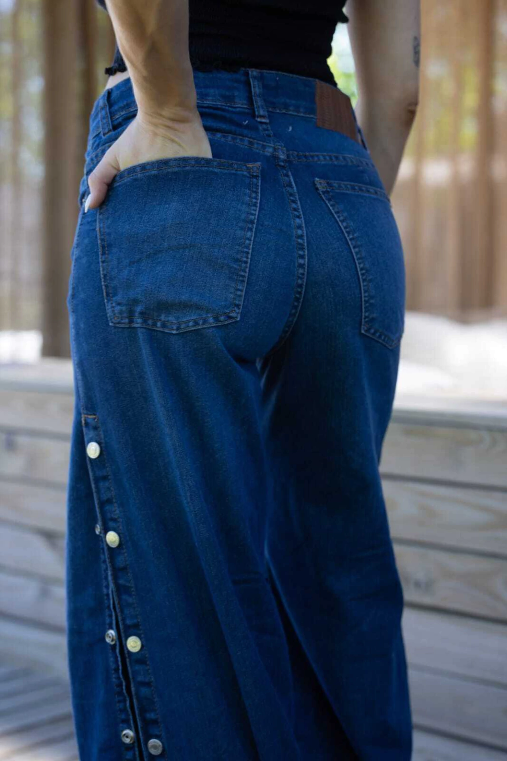 Su diseño wide leg de tiro alto estiliza la figura y alarga visualmente las piernas, mientras que los broches a presión aportan un detalle funcional y contemporáneo. El tono azul oscuro, apenas gastado, realza su carácter clásico con un toque urbano y refinado.